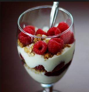 Fordel et lag ricottacreme i fire dessertglas, Tilsæt derefter rabarberkompot drys med lidt knas. Fordel det sidste af ricottacremen i hvert glas og drys så med knas igen. Pynt med de friske bær. Server straks.